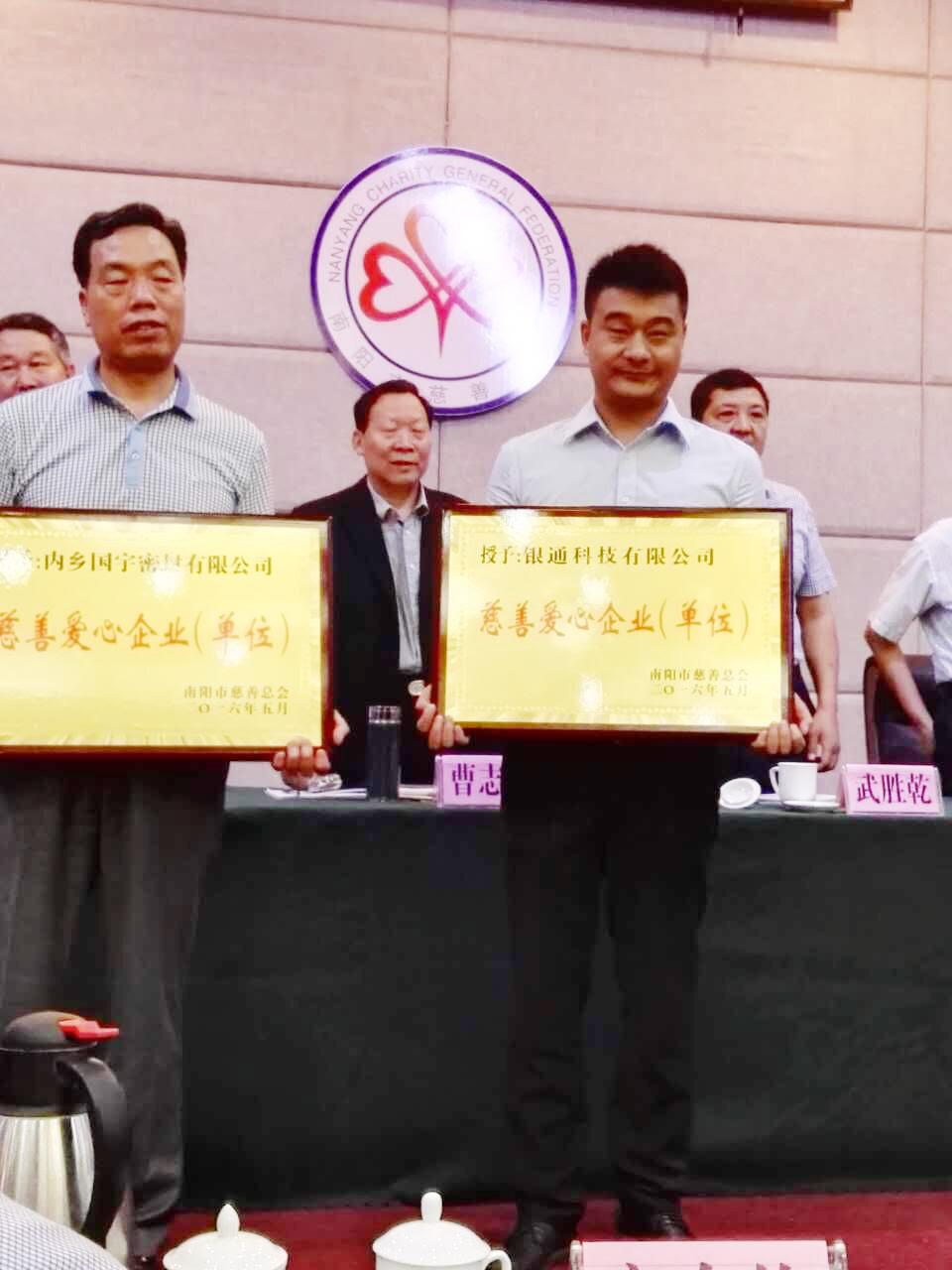 南陽(yáng)銀通近年來(lái)連續(xù)獲得南陽(yáng)市慈善總會(huì)愛(ài)心企業(yè),董事長(zhǎng)王寶玉先生連年榮獲先進(jìn)個(gè)人榮譽(yù)稱號(hào)并擔(dān)任慈善總會(huì)理事會(huì)副會(huì)長(zhǎng)職務(wù)。南陽(yáng)銀通自成立以來(lái)始終以“誠(chéng)信、高效”為理念,以“質(zhì)量為本,服務(wù)至上”為宗旨,“慈善和愛(ài)心”為義務(wù),努力創(chuàng)造優(yōu)質(zhì)產(chǎn)品,打造良心企業(yè)。