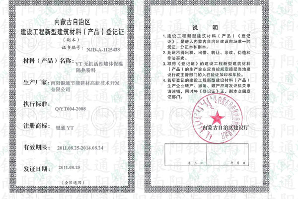 南陽銀通內(nèi)蒙古自治區(qū)建設工程新型建筑材料(產(chǎn)品)登記證