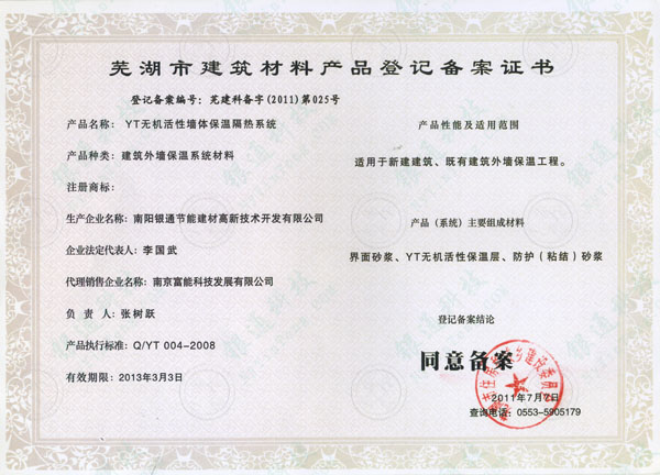 蕪湖市建筑材料產(chǎn)品登記備案證書(shū)南陽(yáng)銀通