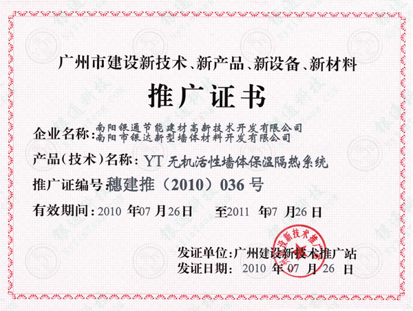 南陽銀通廣州市建設(shè)新技術(shù)、新產(chǎn)品、新設(shè)備、新材料推廣證書