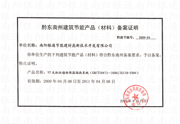 黔東南州建筑節(jié)能產(chǎn)品(材料)備案證明
