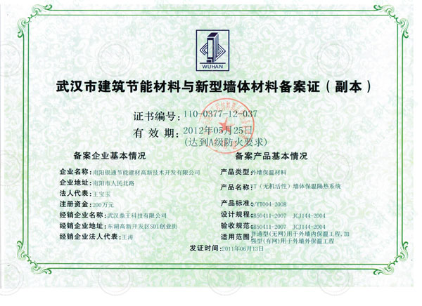 武漢市建筑節(jié)能材料與新型墻體材料備案證