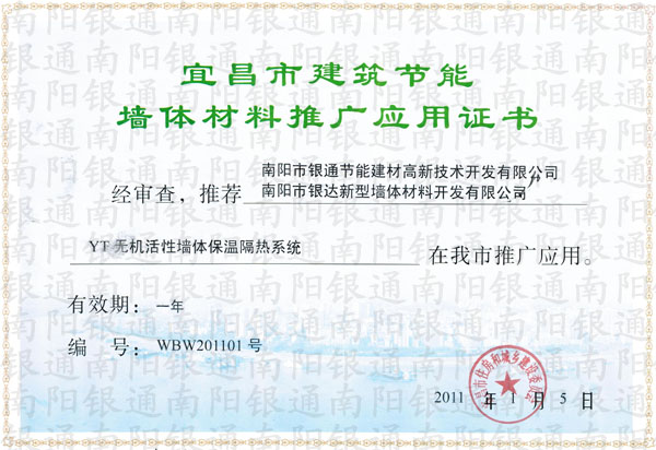 宜昌市建筑節(jié)能墻體材料推廣應(yīng)用證書 經(jīng)審查,推薦南陽市銀通節(jié)能建材高新技術(shù)開發(fā)有限公司,南陽市銀達(dá)新型墻體材料開發(fā)有限公司,YT無機(jī)活性墻體保溫隔熱系統(tǒng)在我市的推廣應(yīng)用。 有效期:一年 編號:WBW201101號 2011年1月5日