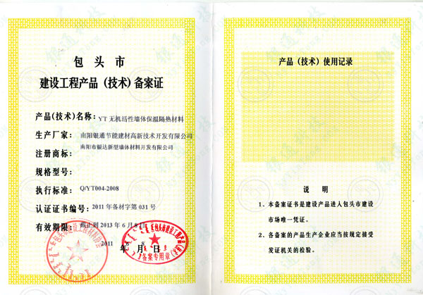 包頭市建設(shè)工程產(chǎn)品(技術(shù))備案證 產(chǎn)品(技術(shù))名稱:YT無(wú)機(jī)活性墻體保溫隔熱材料 生產(chǎn)廠家:南陽(yáng)銀通節(jié)能建材高新技術(shù)開(kāi)發(fā)有限公司 南陽(yáng)市銀達(dá)新型墻體材料開(kāi)發(fā)有限公司 執(zhí)行標(biāo)準(zhǔn):Q/YT004-2008 認(rèn)證證書(shū)編號(hào):2011年備材字第031號(hào) 有效期:截至到2013年6月8日 包頭市建設(shè)工程產(chǎn)品(技術(shù))備案專用章 2011年6月8日 產(chǎn)品(技術(shù))使用記錄 說(shuō)明:1.本備案證書(shū)是建設(shè)產(chǎn)品進(jìn)入包頭市建設(shè)市場(chǎng)唯一憑證。 2.各備案的產(chǎn)品生產(chǎn)企業(yè)應(yīng)當(dāng)按規(guī)定接受發(fā)證機(jī)關(guān)的檢驗(yàn)。