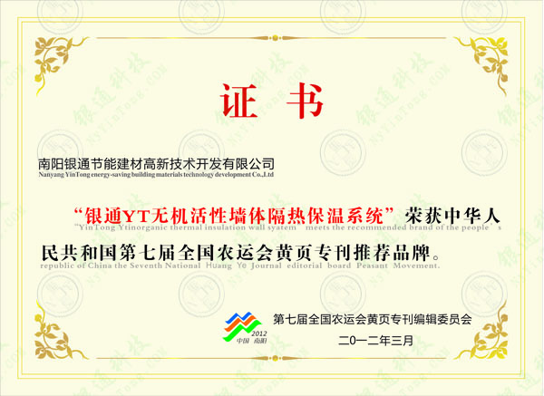 證書 南陽銀通節(jié)能建材高新技術(shù)開發(fā)有限公司 “銀通YT無機(jī)活性墻體隔熱保溫系統(tǒng)”榮獲中華人民共和國第七屆全國農(nóng)運(yùn)會黃頁專刊推薦品牌。 第七屆全國農(nóng)運(yùn)會黃頁專刊編輯委員會 二零一二年三月
