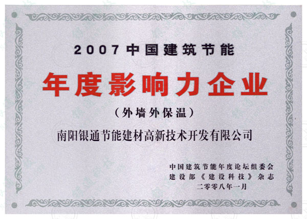 2007中國建筑節(jié)能年度影響力企業(yè)(外墻外保溫) 南陽銀通節(jié)能建材高新技術開發(fā)有限公司 中國建筑節(jié)能年度論壇組委會 建設部《建設科技》雜志 二零零八年一月