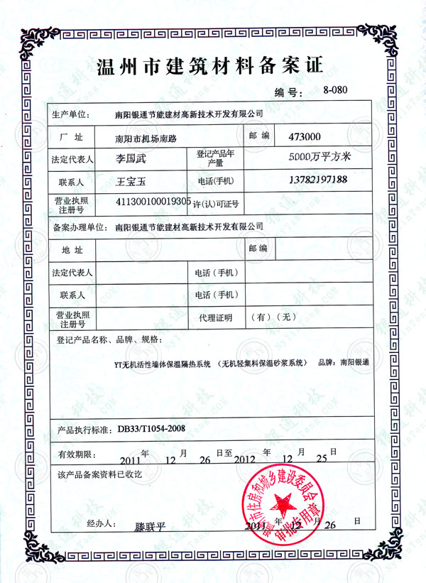 溫州市建筑材料備案證 編號(hào):8-080 生產(chǎn)單位:南陽(yáng)銀通節(jié)能建材高新技術(shù)開(kāi)發(fā)有限公司 登記產(chǎn)品名稱(chēng)、品牌、規(guī)格:YT無(wú)機(jī)活性墻體保溫隔熱系統(tǒng)(無(wú)機(jī)輕集料保溫砂漿系統(tǒng)) 品牌:南陽(yáng)銀通 產(chǎn)品執(zhí)行標(biāo)準(zhǔn):DB33/T1054-2008 有效期:2011年12月26日至2012年12月25日 該產(chǎn)品備案資料已收訖 溫州市住房和城鄉(xiāng)建設(shè)委員會(huì) 審批專(zhuān)用章 2011年12月26日