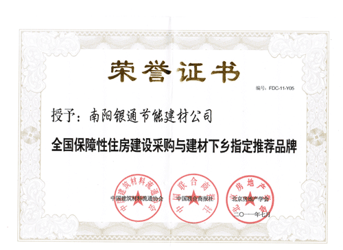 2011年7月17-18日在釣魚臺國賓館、天壇飯店召開“中國房地產(chǎn)50人論壇2011北京夏季峰會——產(chǎn)業(yè)轉(zhuǎn)型與融資戰(zhàn)略高層研討會”上,中國建筑材料流通協(xié)會,中國聯(lián)合商報社和北京房地產(chǎn)學(xué)會聯(lián)合發(fā)布,授予南陽銀通節(jié)能建材公司全國保障性住房建設(shè)采購與建材下鄉(xiāng)指定推薦品牌!