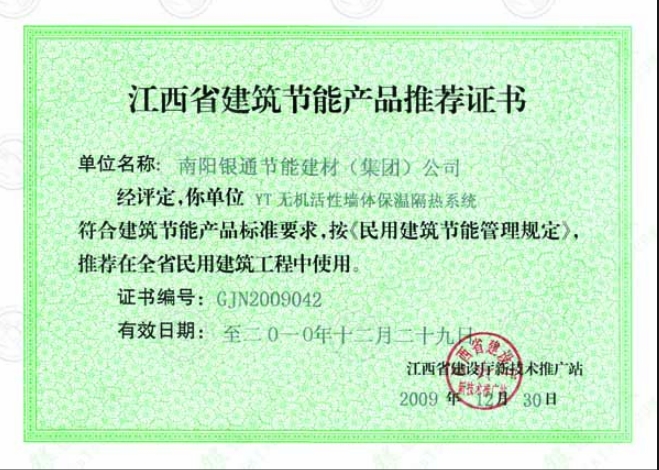 【曾獲】 江西省建筑節(jié)能產(chǎn)品核準(zhǔn)證書 證書有效期至:2010年12月29日