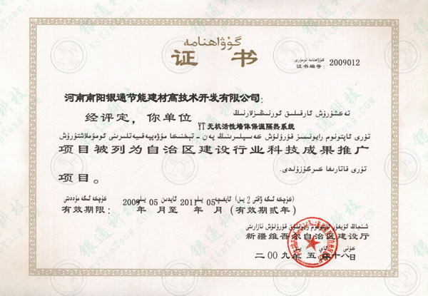 新疆省建筑節(jié)能產(chǎn)品核準(zhǔn)證書 有效期限:2009年05月至2011年05月,有效期兩年