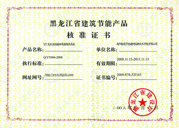 此證書為歷年曾獲證書,本介紹頁僅為方便用戶了解查詢企業(yè)歷史資質,望悉知 黑龍江省建筑節(jié)能產(chǎn)品核準證書 有效期限:2009.11.13-2011-11.13