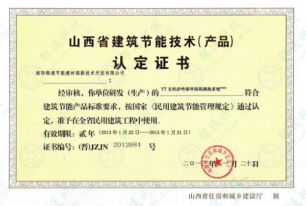 南陽銀通節(jié)能建材高新技術(shù)開發(fā)有限公司:經(jīng)審核,你單位研發(fā)(生產(chǎn))的YT無機(jī)活性墻體保溫隔熱系統(tǒng)符合建筑節(jié)能產(chǎn)品標(biāo)準(zhǔn)要求,按國(guó)家《民用建筑節(jié)能管理規(guī)定》通過認(rèn)定,準(zhǔn)予在全省民用建筑工程中使用。有效期限:貳年(2013年1月22日——2015年1月21日) 證書編號(hào):(晉)JZJN2012684號(hào) 二貳〇一三年一月二十日