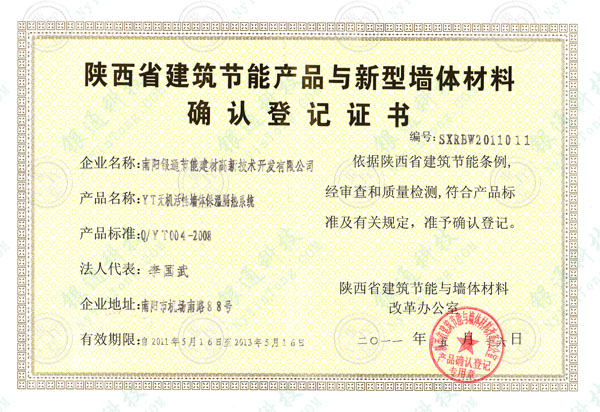 陜西省建筑節(jié)能產(chǎn)品與新型墻體材料確認(rèn)登記證書 有效期限 :2011年5月16日至2013年5月16日