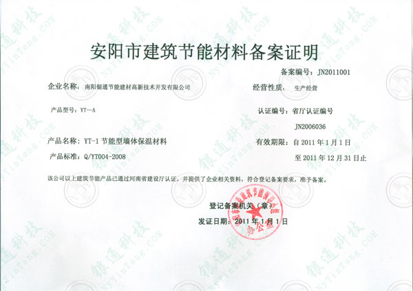 河南省安陽(yáng)市建筑節(jié)能材料備案證明 備案編號(hào)JN2011001企業(yè)名稱南陽(yáng)銀通節(jié)能建材高新技術(shù)開(kāi)發(fā)有限公司 規(guī)格型號(hào)YT-A 認(rèn)證編號(hào)省廳認(rèn)證編號(hào)JN2006236 產(chǎn)品名稱YT-1節(jié)能型墻體保溫材料 有效期至2011年12月31日 該公司以上建筑節(jié)能產(chǎn)品已通過(guò)河南省建設(shè)廳認(rèn)證 并提供了企業(yè)相關(guān)資料 符合登記備案要求 準(zhǔn)予備案 登記備案機(jī)關(guān) 安陽(yáng)市建委建筑節(jié)能領(lǐng)導(dǎo)小組辦公室 發(fā)證日期2011年1月1日