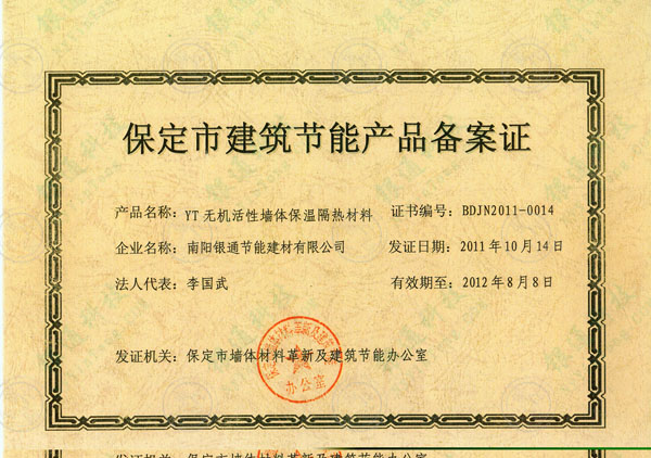 河北保定市建筑節(jié)能產(chǎn)品備案證 產(chǎn)品名稱 YT無機(jī)活性墻體保溫隔熱材料 證書編號(hào)BDJN2011-0014 企業(yè)名稱 南陽銀通節(jié)能建材有限公司 發(fā)證日期2011年10月14日 有效期至2012年8月8日 發(fā)證機(jī)關(guān) 保定市墻體材料革新及建筑節(jié)能辦公室