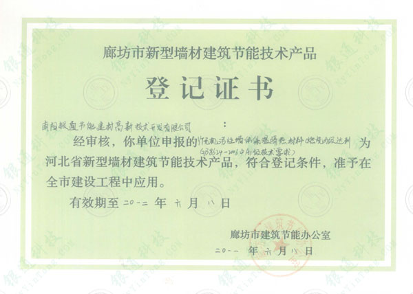 河北廊坊市新型墻材建筑節(jié)能技術(shù)產(chǎn)品登記證書 南陽銀通節(jié)能建材高新技術(shù)開發(fā)有限公司 南陽市銀達(dá)新型墻體材料開發(fā)有限公司 經(jīng)審查 你單位申報(bào)的YT無機(jī)活性墻體保溫材料燃燒等級(jí)達(dá)到GB8624-2006中A1級(jí)技術(shù)要求為河北省新型墻材建筑節(jié)能技術(shù)產(chǎn)品 符合登記條件 準(zhǔn)許在全市建筑工程中使用 有效期至2012年6月8日廊坊 2011年6月8日