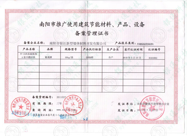 河南省南陽市推廣使用建筑節(jié)能材料產(chǎn)品設(shè)備備案管理證書 企業(yè)名稱 南陽市銀達新型墻體材料開發(fā)有限公司 產(chǎn)品名稱YT無機保溫隔熱A級不燃材料 系統(tǒng)類別外墻保溫漿體材料 認(rèn)證編號省建設(shè)廳推廣證書編號101002 備案登記號2011027 規(guī)格型號YT-A 產(chǎn)品型號50kg/袋 注冊商標(biāo)銀通 銀達 有效期限三年 該公司以上建筑節(jié)能產(chǎn)品已通過河南省建設(shè)廳認(rèn)證 并提供了企業(yè)相關(guān)資料 同意備案 登記備案機關(guān) 南陽市建筑節(jié)能管理辦公室 發(fā)證日期2010年7月20日