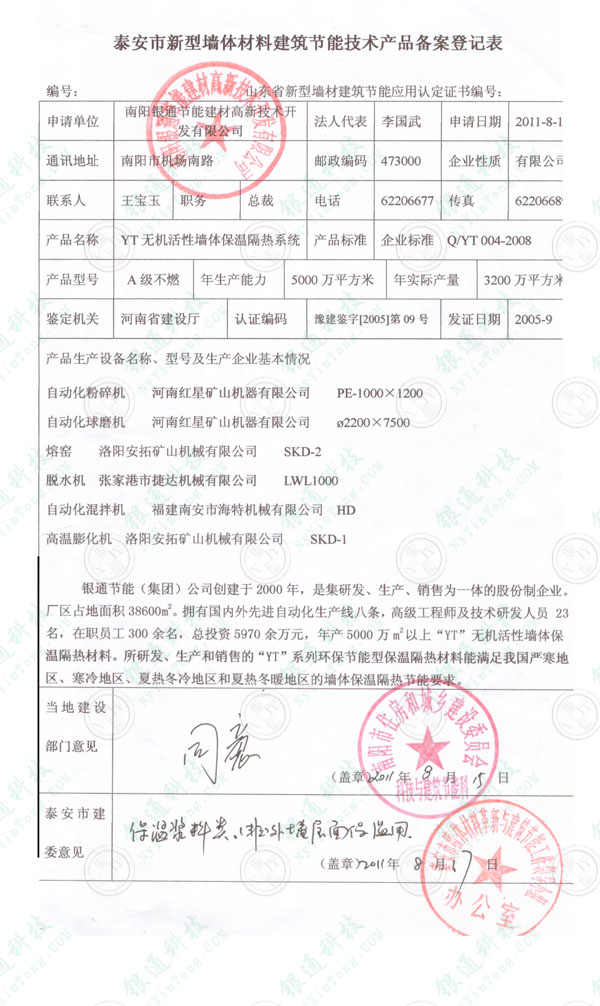 山東泰安市新型墻體材料建筑節(jié)能技術產(chǎn)品備案登記證 山東省新型墻材建筑節(jié)能應用認定證書 南陽銀通節(jié)能建材高新技術開發(fā)有限公司 你單位生產(chǎn)的yt無機活性墻體保溫隔熱系統(tǒng) 已經(jīng)取得山東省新型墻材建筑節(jié)能技術產(chǎn)品認定證書 同意在我市建設工程保溫漿料中應用 當?shù)亟ㄔO部門意見 南陽市住房和城鄉(xiāng)建設委員會科技與建筑節(jié)能科 同意推廣應用 泰安市建委意見 保溫漿料類 外墻屋面保溫用 泰安市墻體材料革新與建筑節(jié)能工作領導小組辦公室 2011年8月17日