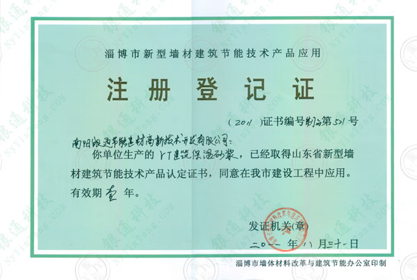 山東淄博市新型墻體建筑節(jié)能技術(shù)產(chǎn)品應(yīng)用注冊(cè)登記證2011證書(shū)編號(hào)第521號(hào) 南陽(yáng)銀通節(jié)能建材高新技術(shù)開(kāi)發(fā)有限公司 你單位生產(chǎn)的yt建筑保溫砂漿 已經(jīng)取得山東省新型墻材建筑節(jié)能技術(shù)產(chǎn)品認(rèn)定證書(shū) 同意在我市建設(shè)工程中應(yīng)用 有效期壹年 發(fā)證機(jī)關(guān) 淄博市墻體材料改革與建筑節(jié)能辦公室 二零零一八月三十一日