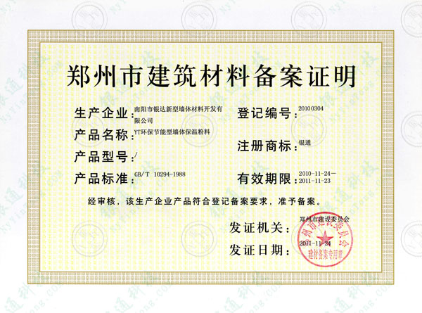 河南鄭州市建筑材料備案證明 南陽市銀達新型墻體材料開發(fā)有限公司 產(chǎn)品名稱YT無機活性墻體保溫隔熱系統(tǒng) 證書編號20100304 注冊商標銀通 有效期限至2011年11月23日 經(jīng)審核該生產(chǎn)企業(yè)產(chǎn)品符合登記備案要求 準予備案 發(fā)證機關 鄭州市建設委員會 鄭州市建設委員會建材備案專用章