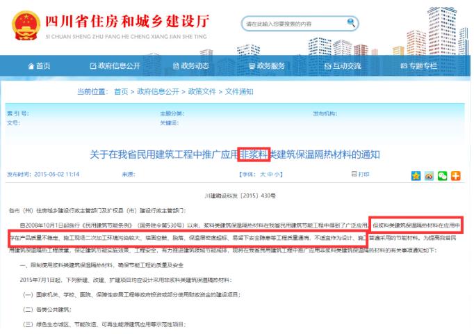 四川省住建廳在2020年6月發(fā)布的關(guān)于發(fā)布建筑保溫材料推廣、限制和禁止產(chǎn)品目錄的公告中限制使用類(lèi)產(chǎn)品中明確限制范圍:不得用于國(guó)家機(jī)關(guān)、學(xué)校、醫(yī)院、保障性安居工程等政府投資或部分使用財(cái)政資金的建設(shè)項(xiàng)目;各類(lèi)公共建筑;綠色生態(tài)城區(qū)、節(jié)能改造、可再生能源建筑應(yīng)用等示范性項(xiàng)目;建筑地上總層數(shù)超過(guò)6層(含6層)的建設(shè)項(xiàng)目;以上項(xiàng)目中不得用于外墻、屋面、樓地面作為主要保溫隔熱材料使用。
