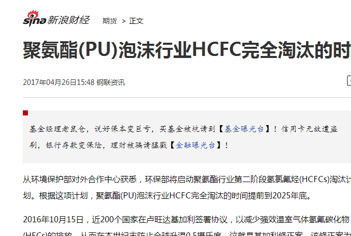 從環(huán)境保護部對外合作中心獲悉,環(huán)保部將啟動聚氨酯行業(yè)第二階段氫氯氟烴(HCFCs)淘汰計劃。根據(jù)這項計劃,聚氨酯(PU)泡沫行業(yè)HCFC完全淘汰的時間提前到2025年底。