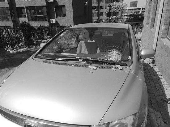 今年5月中旬的一個傍晚,從市外趕回家的董先生照常把車停在老地方,“那時候沒有警戒線,我也不知道不能停在那里。第二天傍晚,熱心鄰居通過車上留的電話聯(lián)系我,說車被砸了。”董先生說,得到消息后,他立刻到現(xiàn)場查看,此時前擋風(fēng)玻璃右下角碎成蜘蛛狀,機關(guān)蓋上散落著墻磚,也被砸出坑。“墻磚應(yīng)該是用水泥砌在樓體上的,質(zhì)感有點像瓷磚,還挺硬的。”董先生回憶道,眼前的景象讓他心驚不已,“幸好我當(dāng)時沒在車附近,否則就沒命了。”董先生說,事后他也聯(lián)系過物業(yè),但得到的說法和記者得到的一樣,董先生只好自認倒霉,花了3000元修理擋風(fēng)玻璃和機關(guān)蓋,從此董先生就把車停在距離家10分鐘路程的地方。